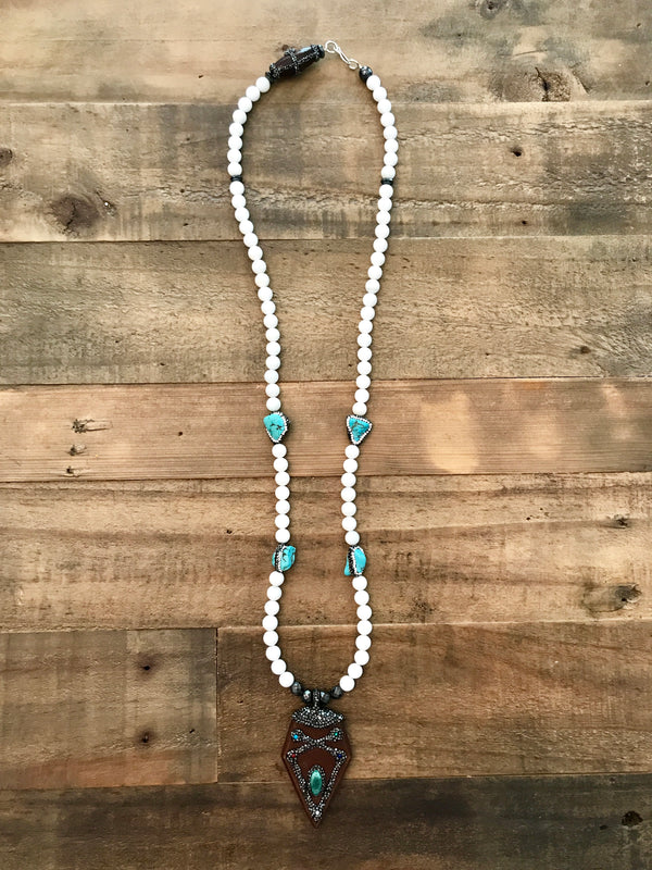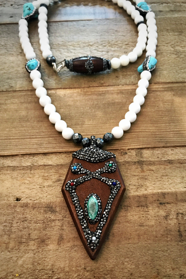 A true tribal statement necklace with all the makings of boho style perfection. This Pride Piece tells a story with all the elements within it: Begin with a beautifully rich wood pendant festooned with twinkling embellishments, including Baby Hematite, Green...